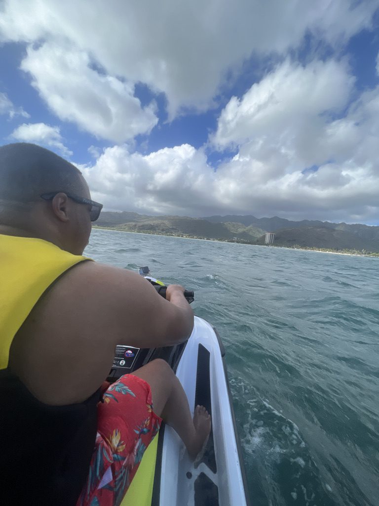 This was a last minute booking – which means it was not on the initial agenda when we arrived, because we were not sure how we would feel by the last day, but I am so glad we ended up adding this in. When I thought about jet skiing in Hawaii, I imagined riding freely around the ocean with only a landmark and the sun to tell me when it was time to go in, I was wrong. H2O Sports has a variety of water activities for the family, from jet skiing, parasailing, banana boating, sunset cruises, etc. They check you in, ensure you have signed all the waivers, and then take you out on a transport boat to what I call their “aquatic hub” it’s a larger boat in the middle of the water with the jet ski’s attached, and where they branch off to take you your other activities. When we arrived on their “hub” we were initially disappointed to learn you are on a “course” or track that is designated with water bougies and pretty much go in a circle on your jet ski for 30 minutes. It sounded boring, and honestly repeating it sounds boarding. However, we were there, we paid for it, we might as well make the most of it. I love riding a Jet Ski, driving, I am honestly not as comfortable… so Tristan drove 😉 there were three other people riding jet ski’s with us, so once Tristan got acclimated to the drive, we spent the next 30 minutes lapping as many people as we could.. it was HILARIOUS and so much fun. Even though we were skiing around in a circle for 30 minutes, you would have never known, especially when you are riding with someone else and just having the time of your life. We did not switch drivers, but you can move to the side and switch drivers as needed.